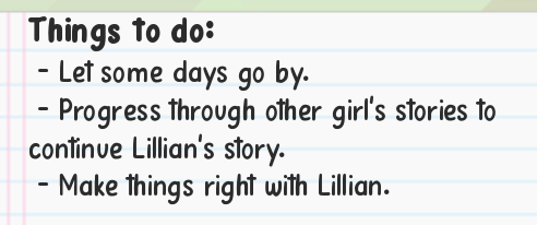 I usualy dont comment on games, but I have a really annoying issue. On the task tab it says that I should wait a few days and that I have to progress other girls stories to continue Lillians story (I have done every event except this one), but every sunday when I go to sleep I get a error message and I think it has something to do with it.